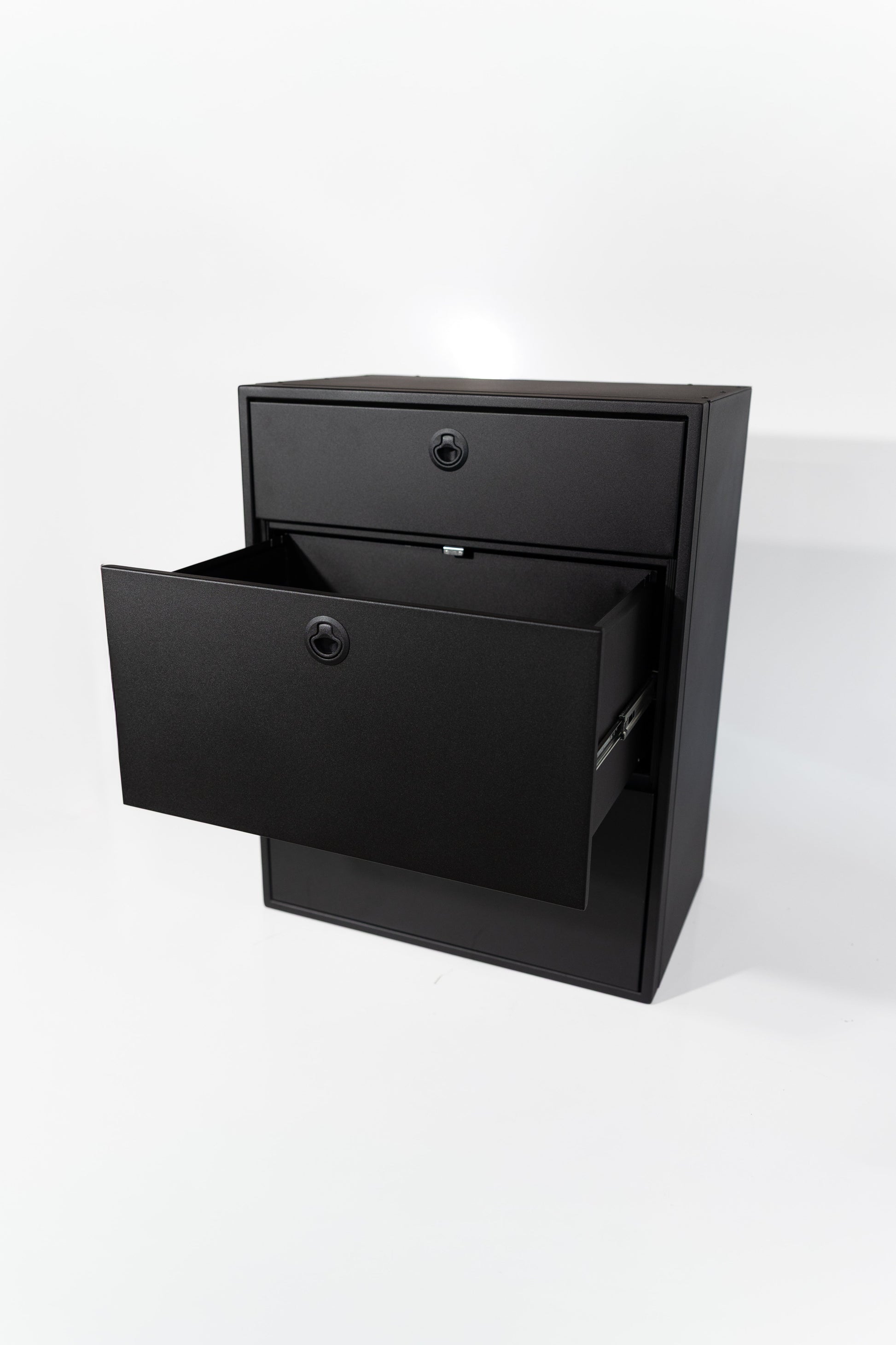 - Powder coated aluminum base cabinet features three soft close full box construction drawers.