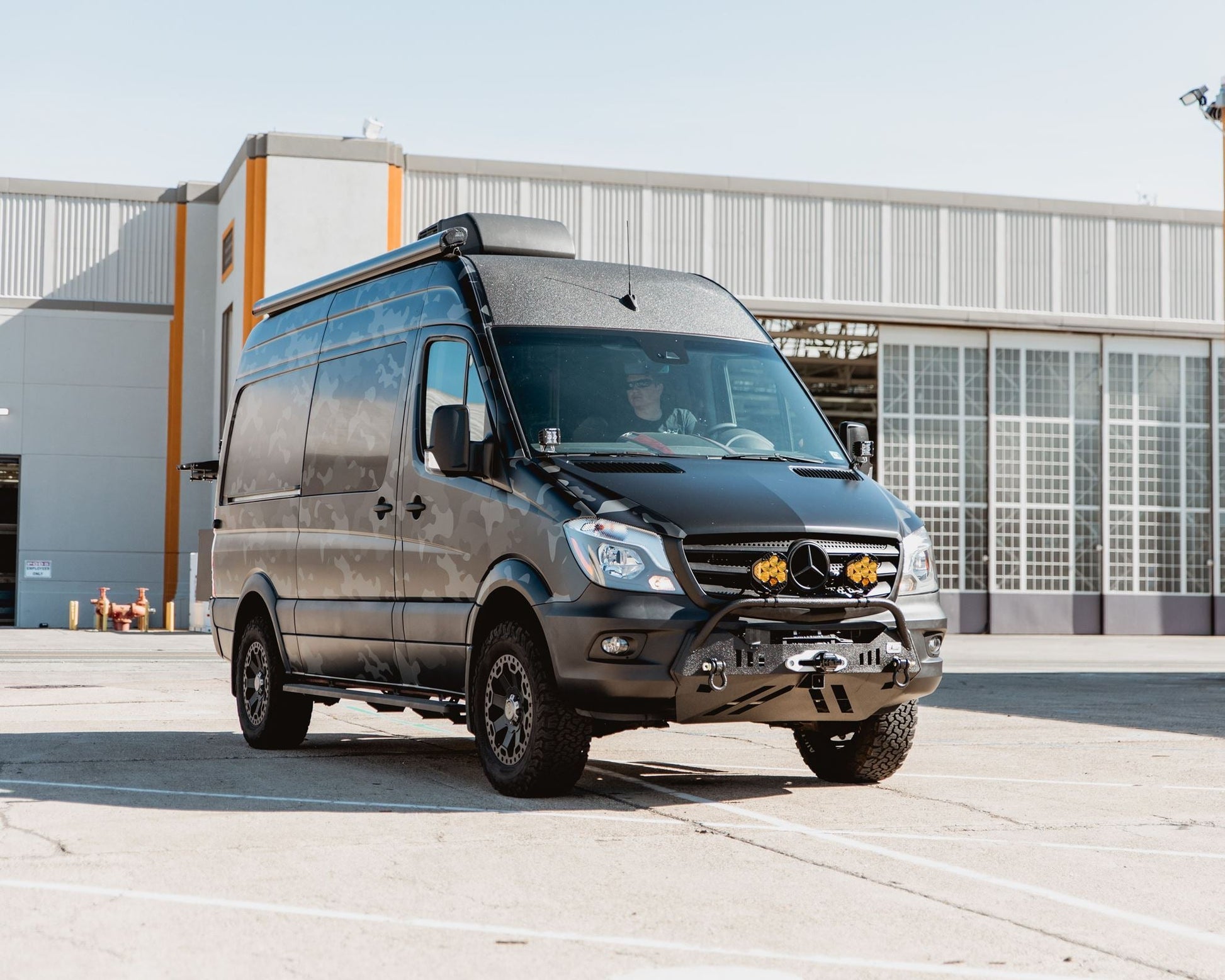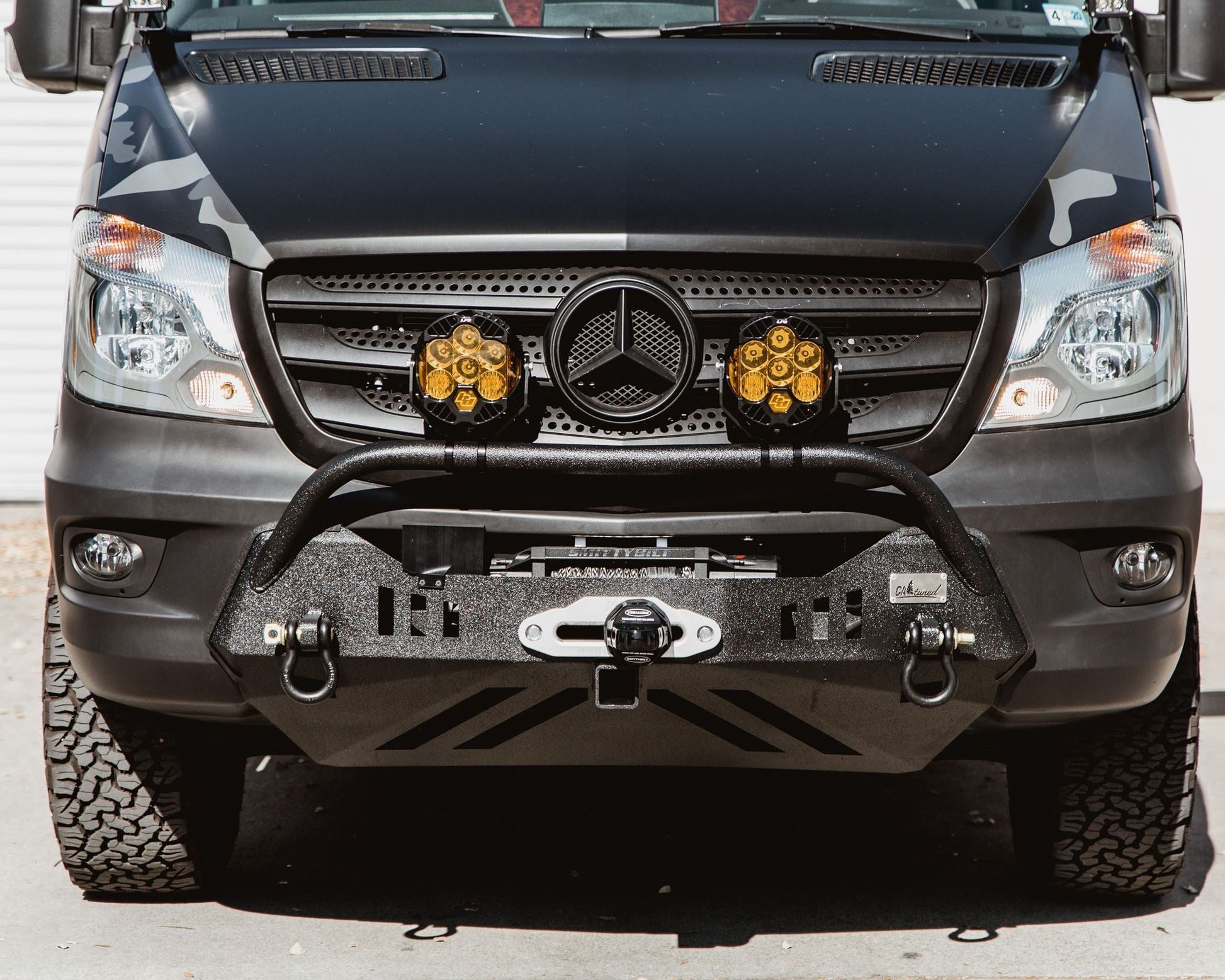 Clean and compact, this bumper walks the perfect line between being rugged and purposeful but not so big it destroys the lines of the Sprinter. All steel construction and welded/fabricated in California, it features an ultra-rugged design, additional front hitch, dual shackles, and is winch ready.