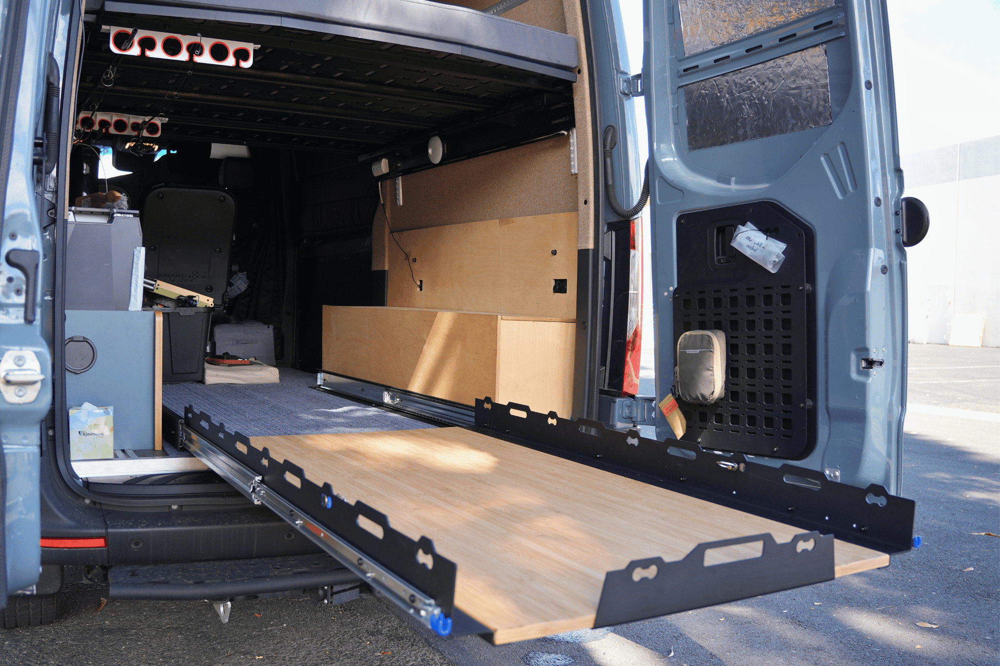 Keep your gear organized and easy to access with our 60" DIY Slide Tray Kit. Whether it’s bikes, camping gear, or all the random essentials you bring on the road, this tray is built to handle it. The kit includes all the hardware you need—you just supply the floor panel cut to the width that fits your setup.