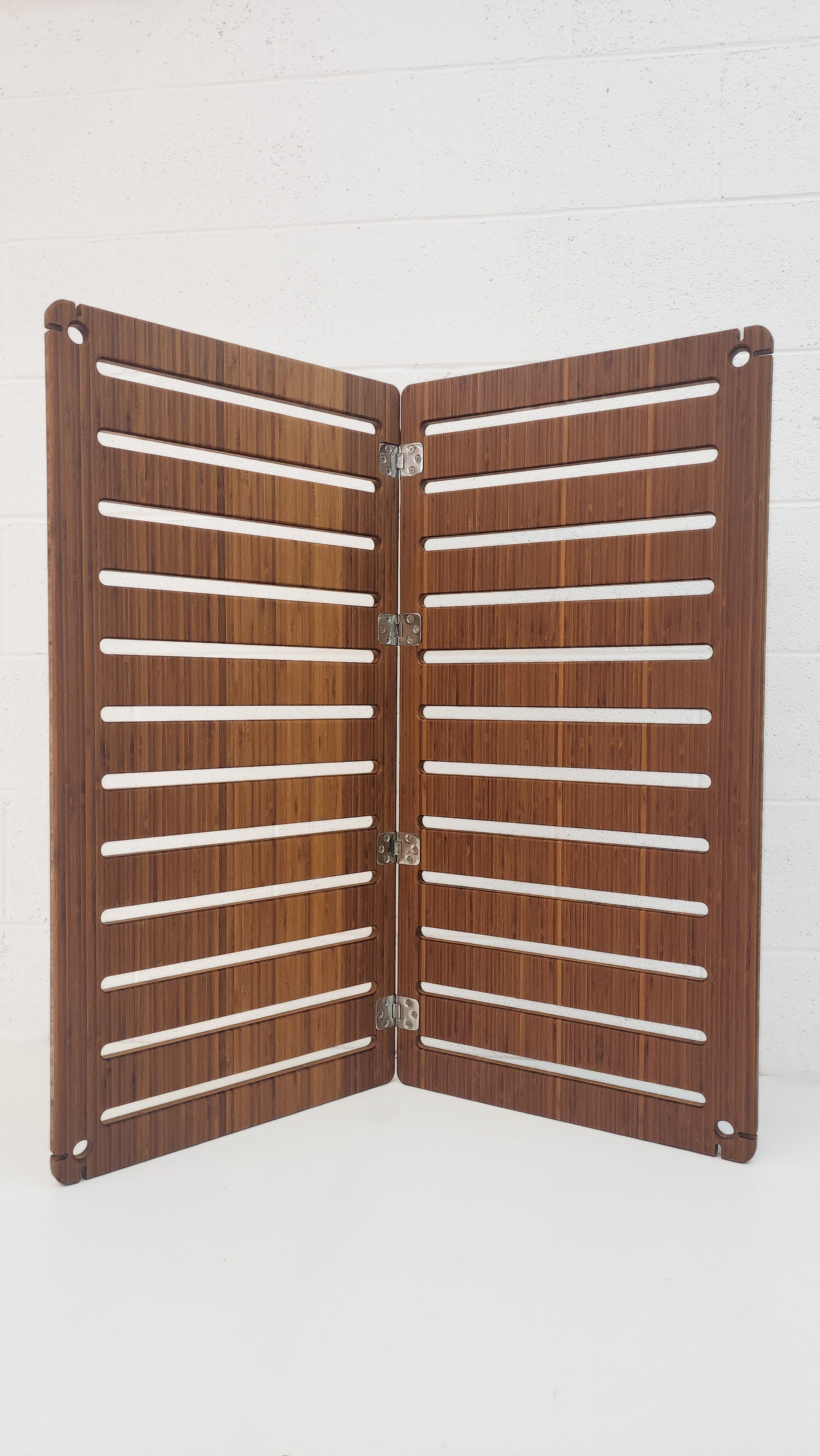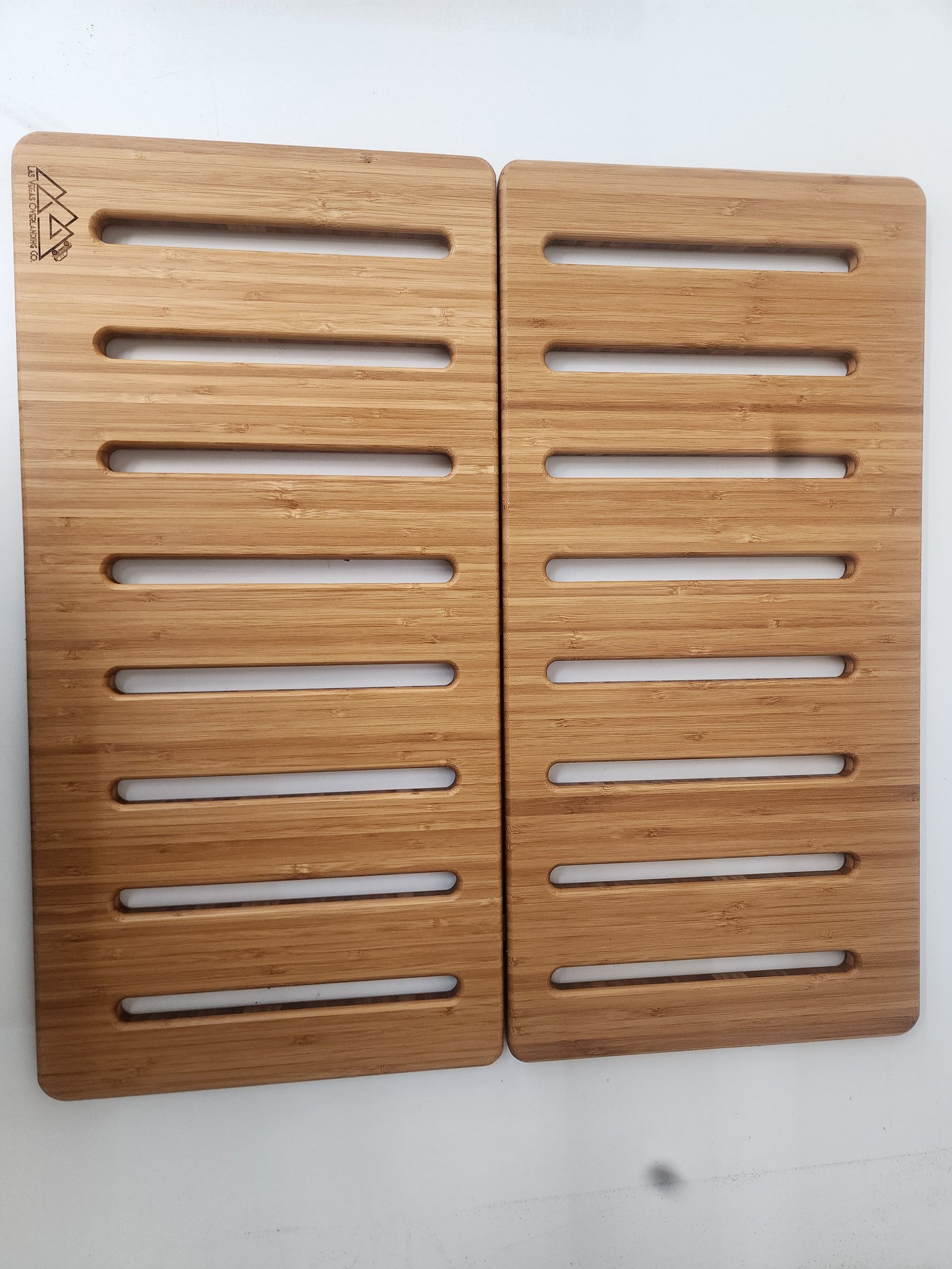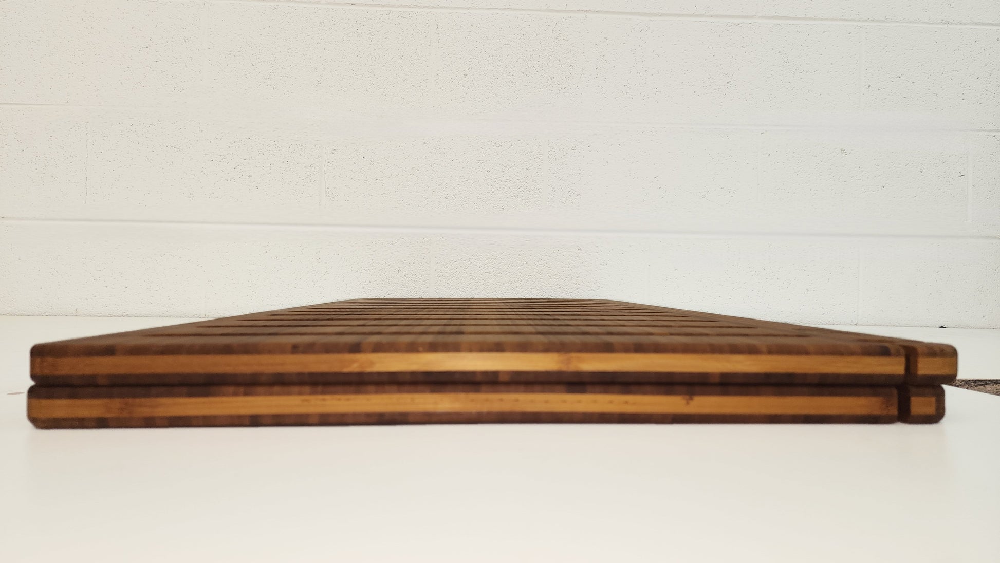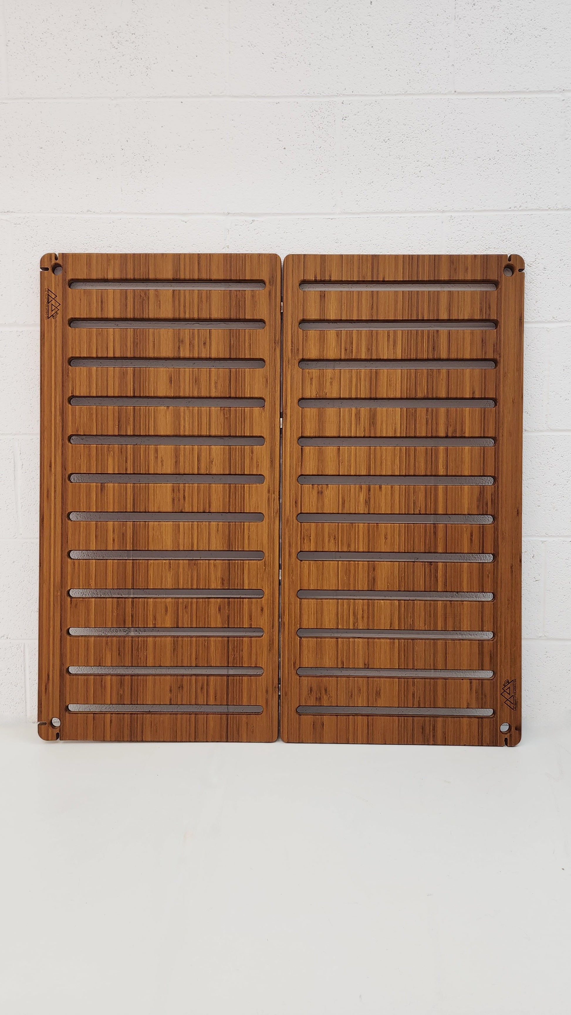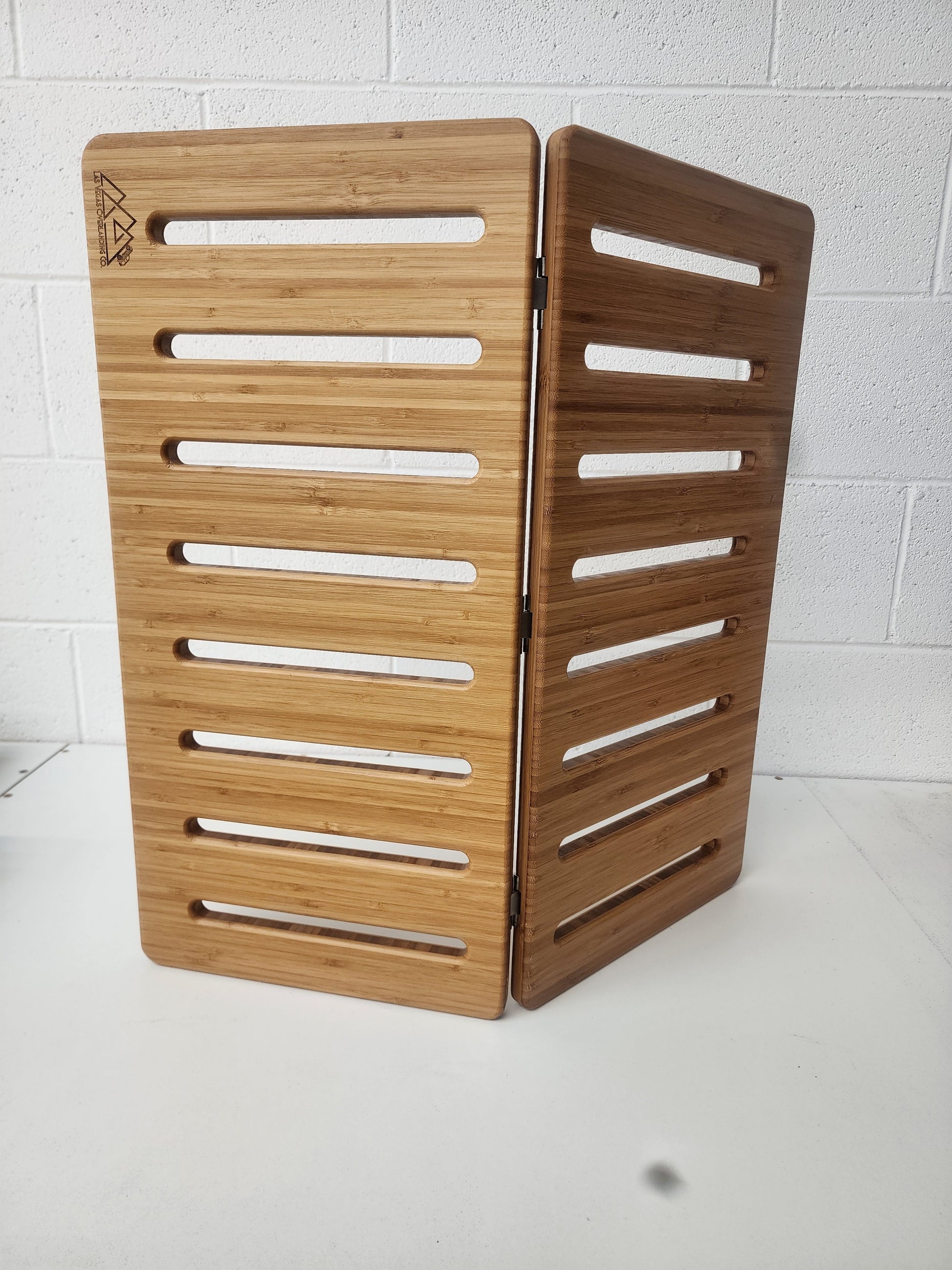 The Double Down shower floor is made of 3/4" bamboo making it durable and water resistant. The slatted design allows water and residue to flow through the floor and away from your feet. The floor design folds down flat so it takes up half the space when stored.