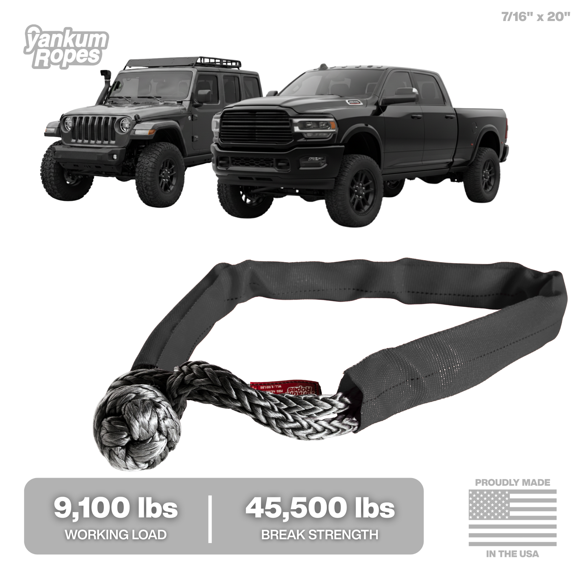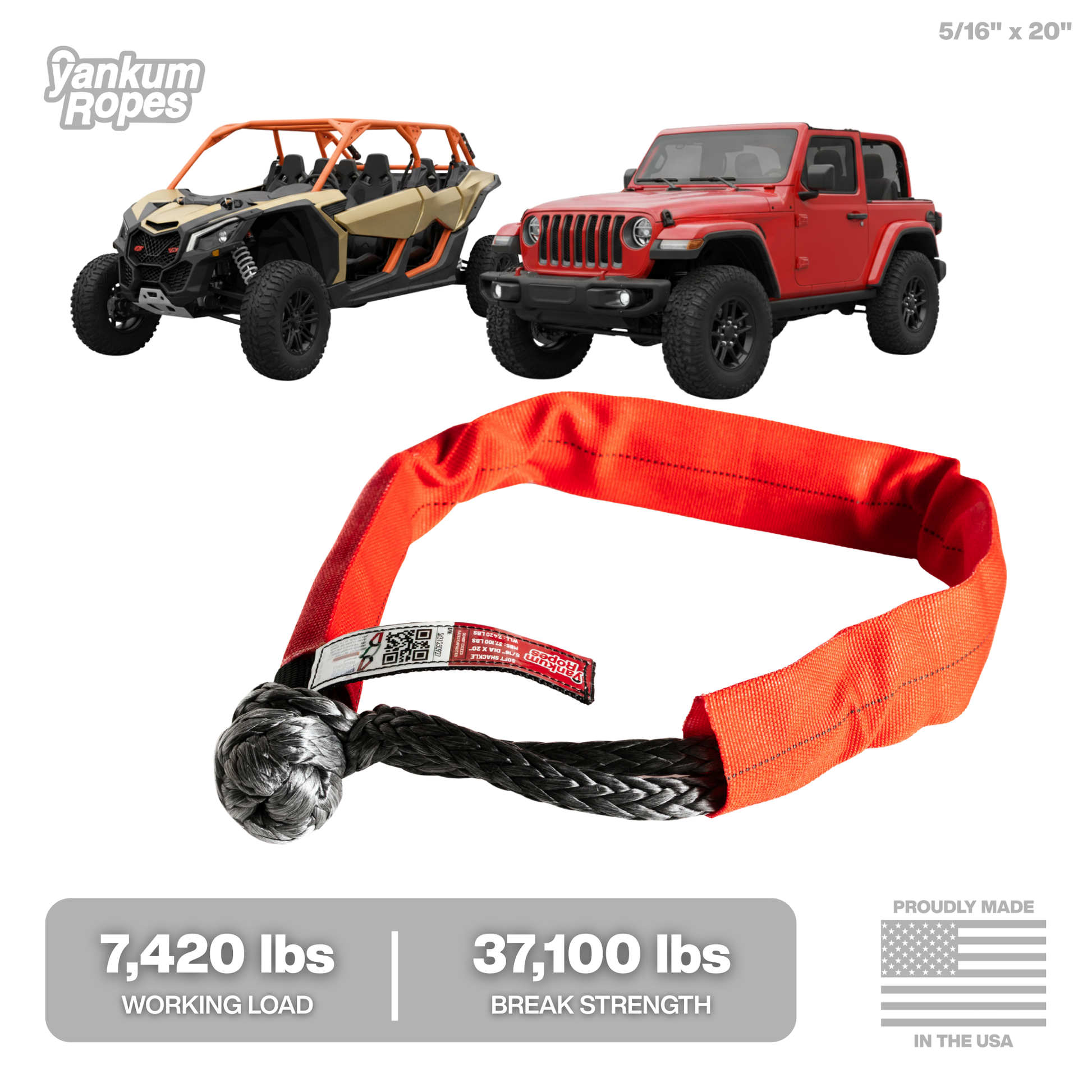 The length is the key difference. The Double Loop Soft Shackles (available in 5/16” and 7/16”) are about twice as long as the soft shackles. This allows you to attach to a hard to reach recovery point, or double it up for about twice the working load limit when winching or connecting ropes together.