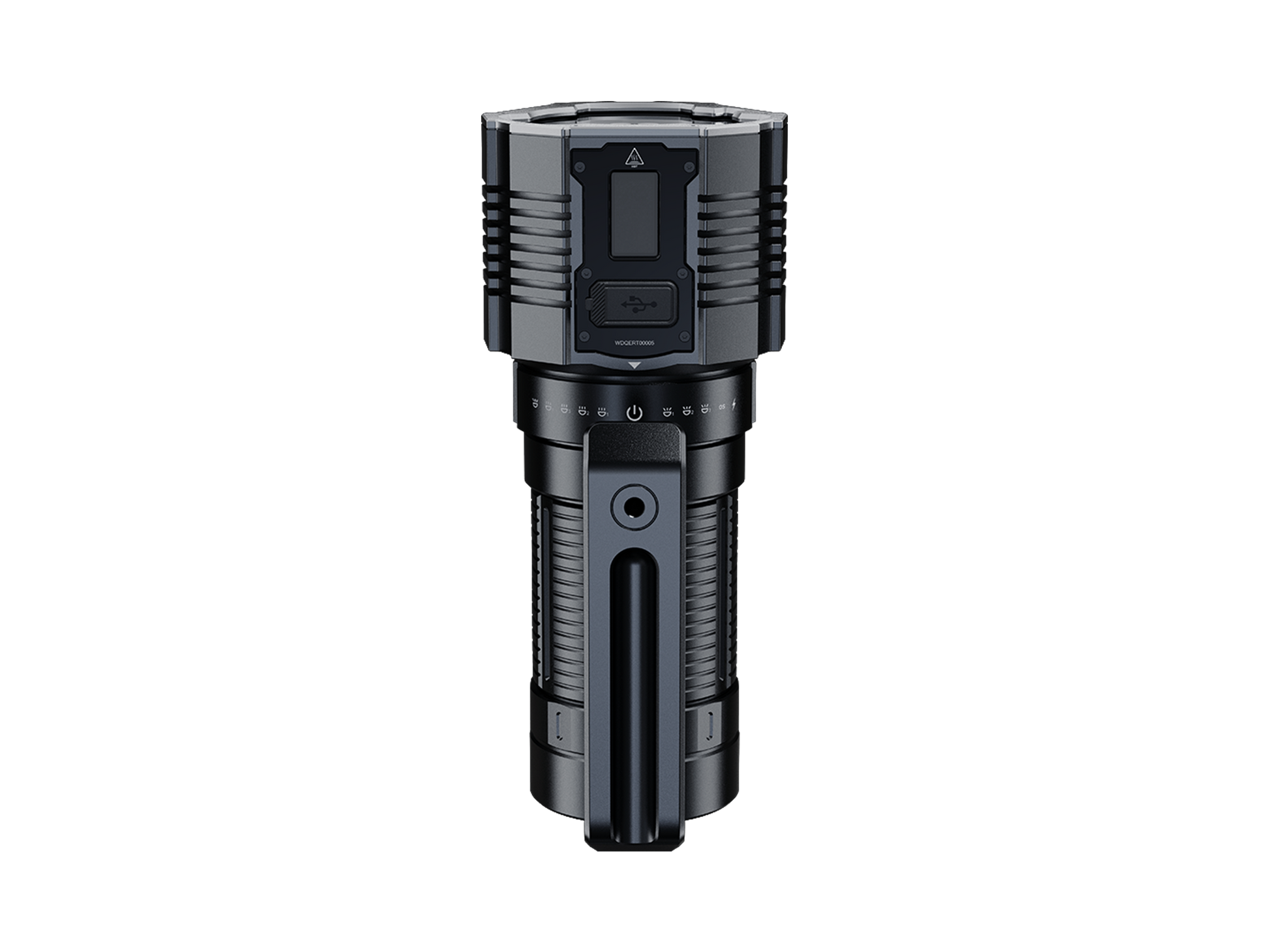 The Fenix LR60R redefines the boundaries of flashlight capabilities, boasting an awe-inspiring 21,000 lumens and 294,267 candela maximum output generating a beam distance of 3,560 ft (1085 meters). This high-end torch features an OLED smart display, a unique addition that informs you of the runtime, output, and battery percentage.