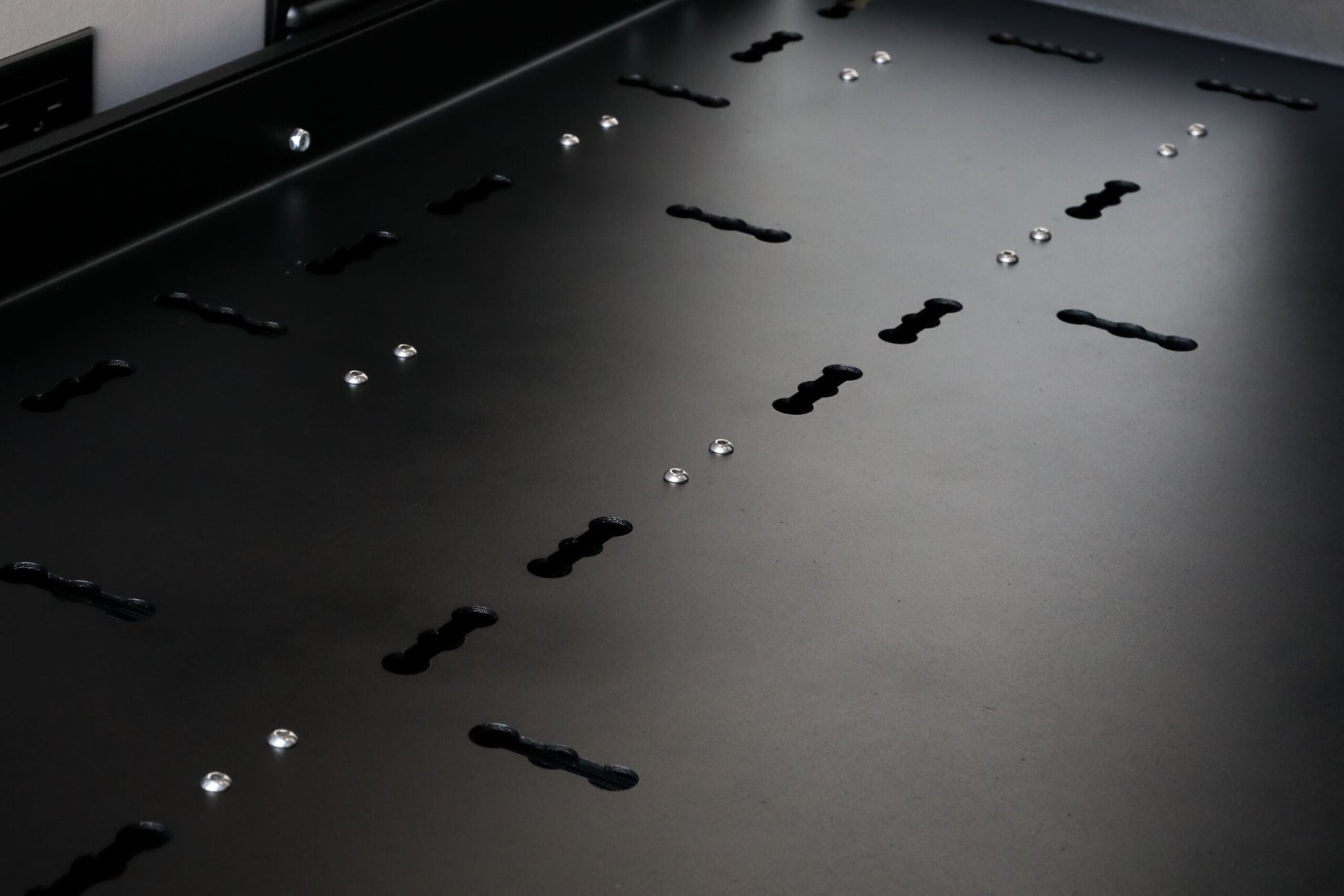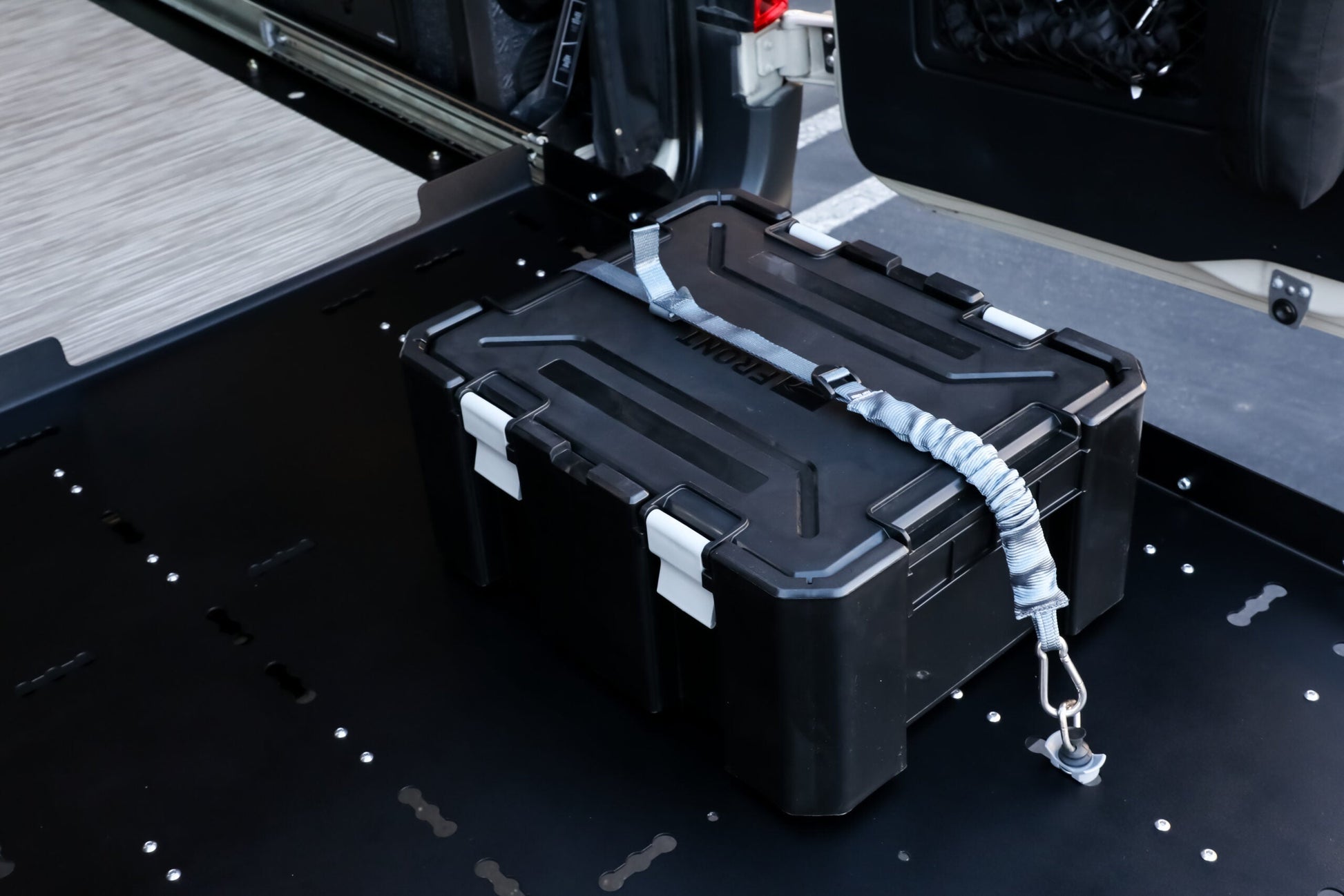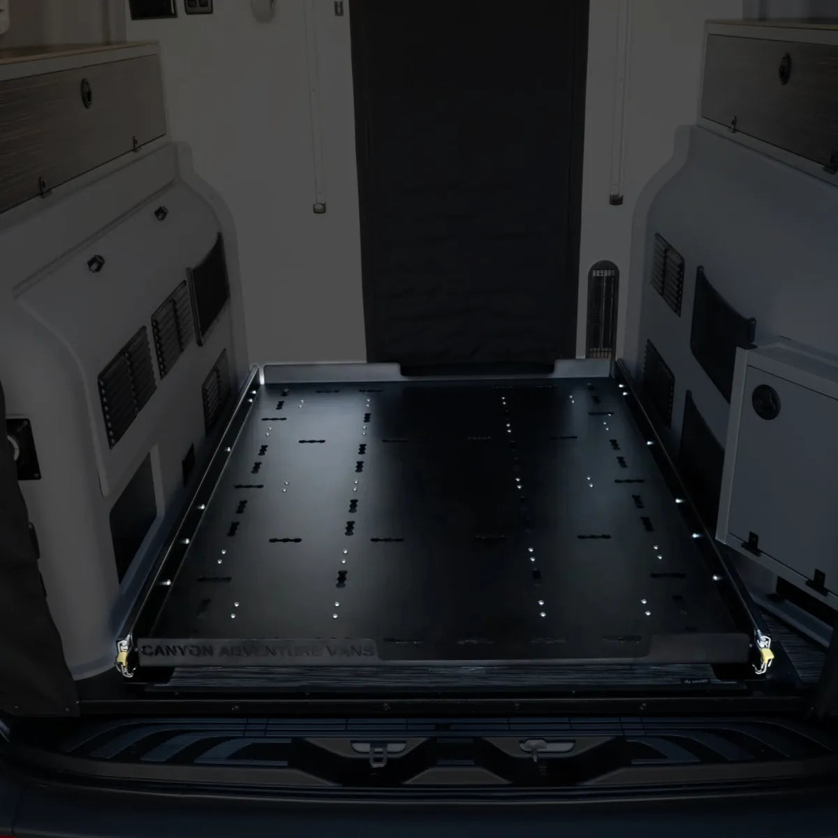 Our signature Garage Slide-Out Deck is much more than your typical cargo tray. It holds all of your gear and more. Our L-Track holes allow you to easily fasten down your gear and secure everything without sliding around.