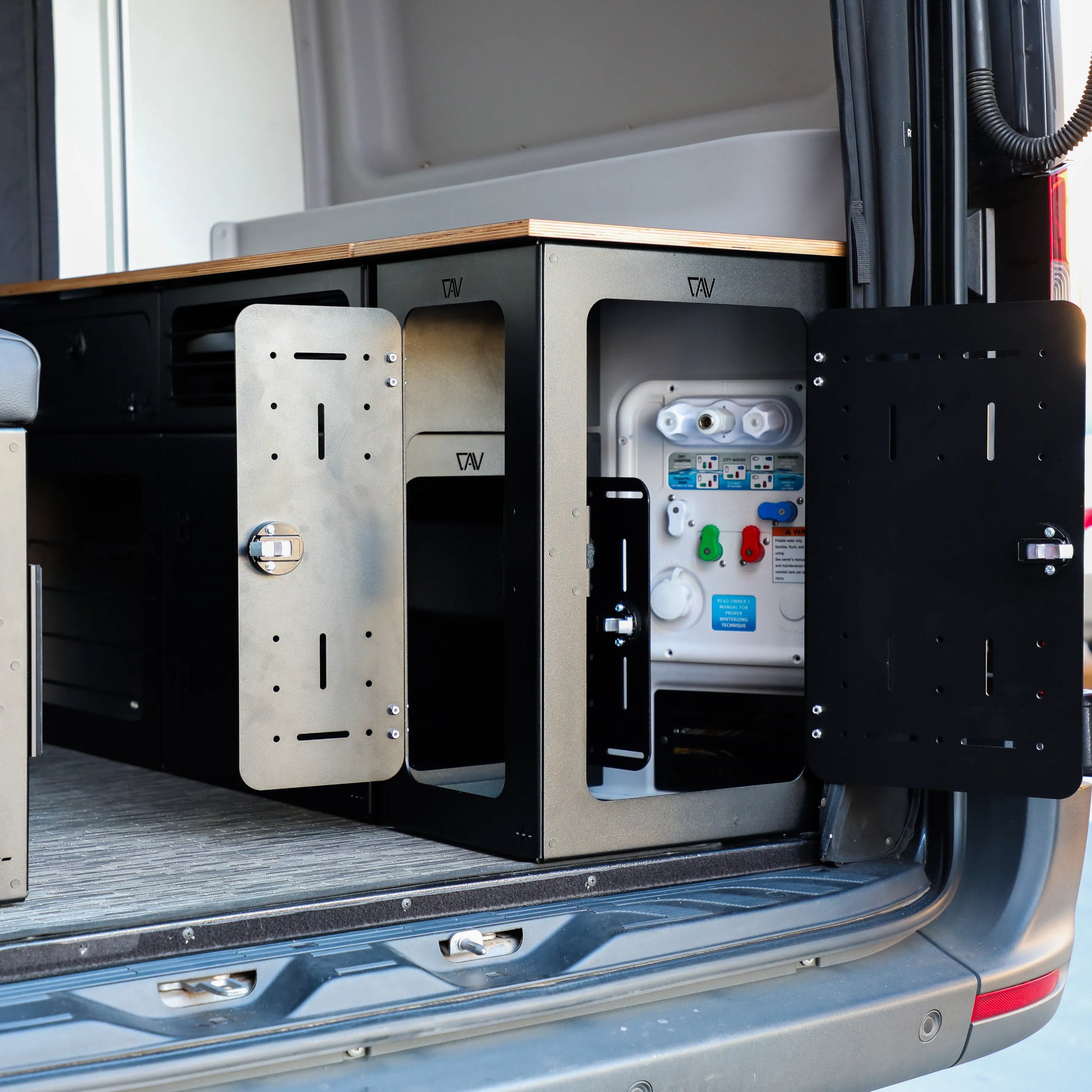 The H2O Storage Box Pro is compatible with Revel, Jayco, Entegra and Tiffin GH1 vans. This versatile storage box and water station cover has laser-cut mounting holes, an end door and a table top for maximum functionality.