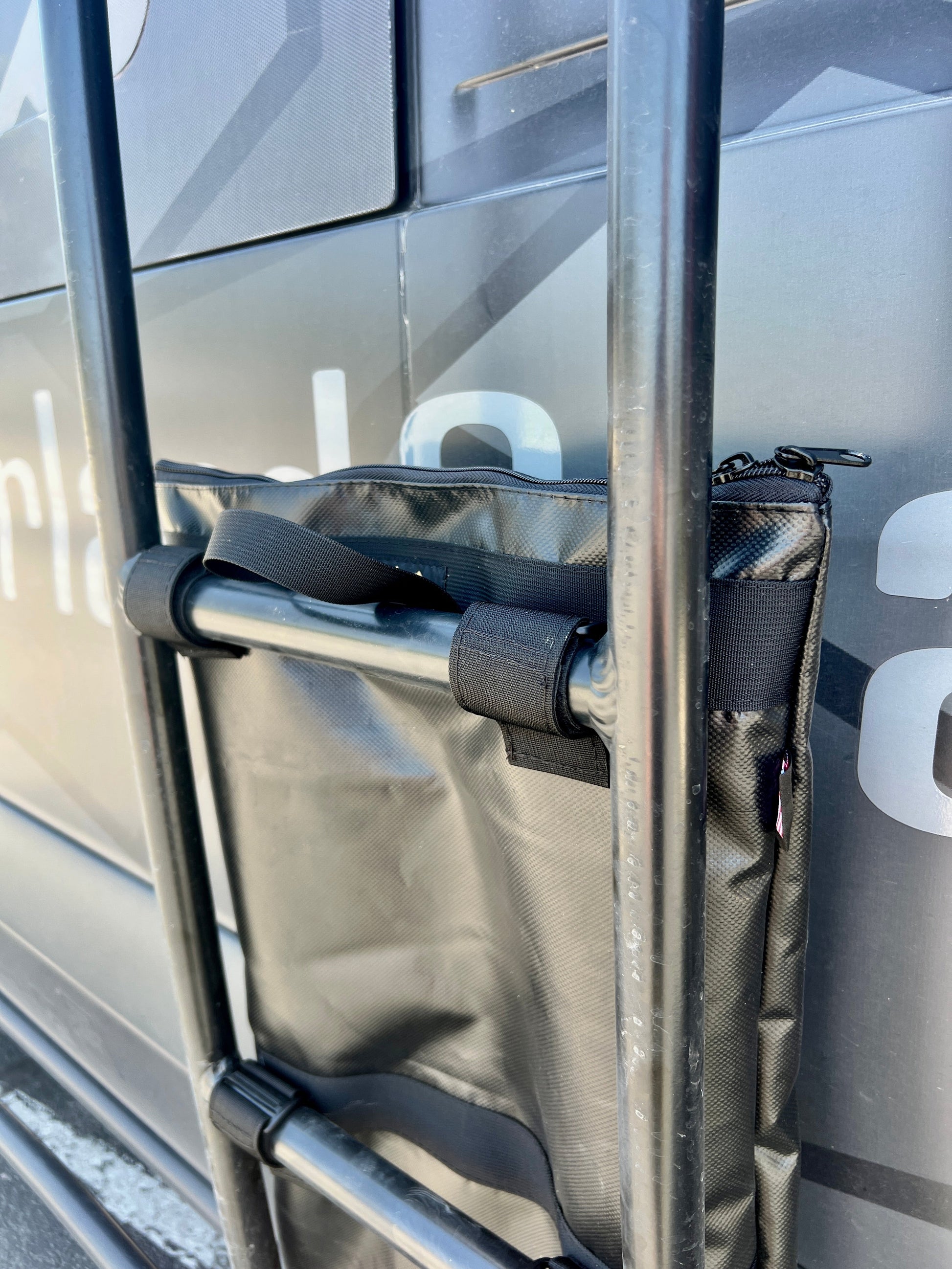 Disclaimer: Do NOT drive with bag mounted on the Outside of ladder, Flip it to the inside of the ladder. Also be careful not to overfill it with sharp heavy objects, you do not want it against the paint on the vehicle.
