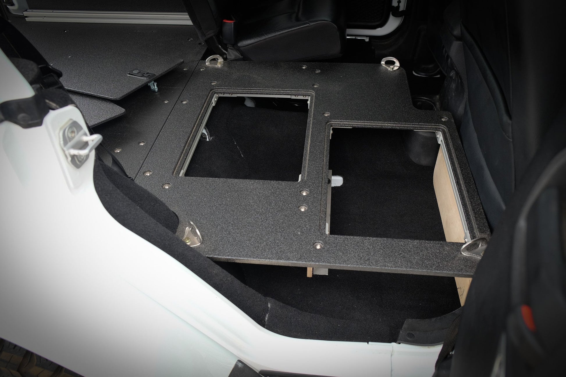 The 60% Passenger Seat Delete Plate System is a bolt in replacement for the 60% passenger second row seat. With this Plate System get two storage access doors and all necessary hardware to bolt it to the vehicle at factory anchor points to attach it to the Jeep Wrangler JKU Plate System, without any extra drilling. If you are installing just the 60% delete you will need to own or purchase a 60% Seat Delete Bracket.