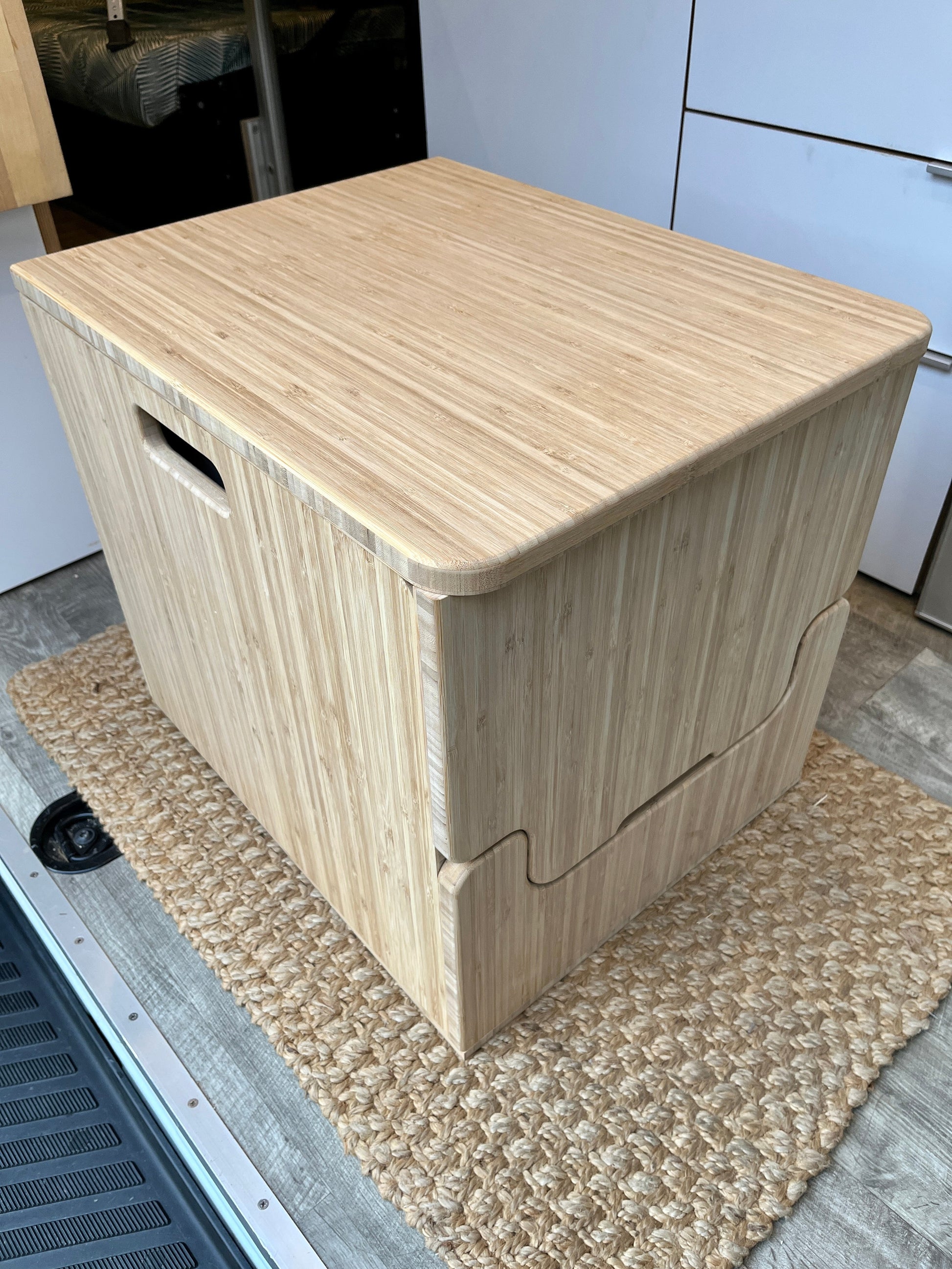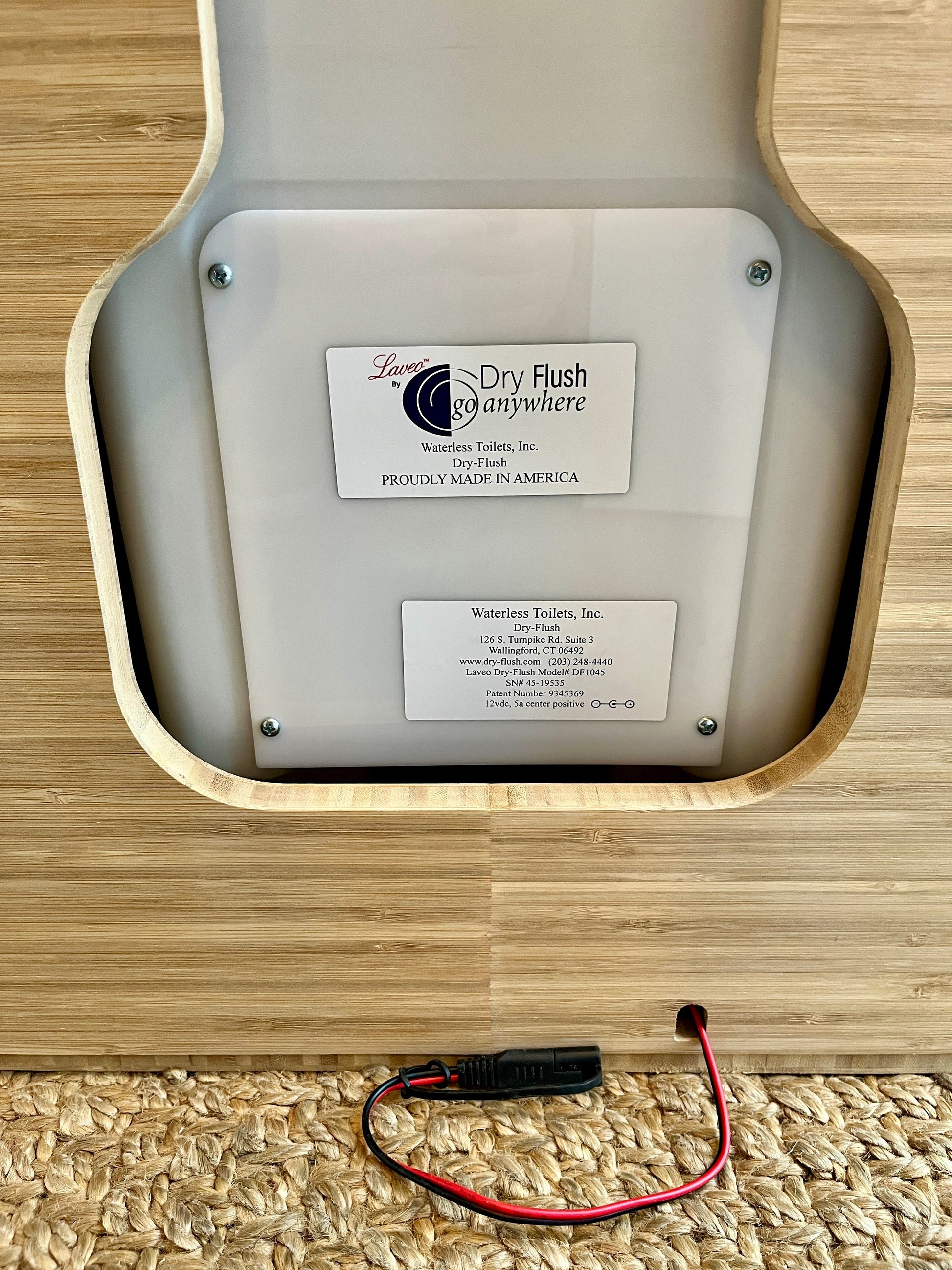 Introducing our innovative and space-saving lift top bamboo van toilet cabinet, designed specifically for the Laveo by Dry Flush Portable Waterless Toilet. The cabinet for the Laveo Toilet includes a cutout on the back for the charge cable so you do not need to remove the toilet to charge. A large opening in the back of the cabinet gives you easy access to the rear removable panel of the toilet.