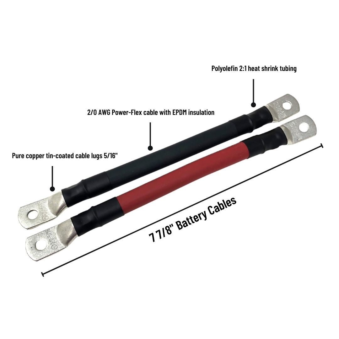 - One pair of interlocking cables includes one black 9" 2/0 gauge cable and one red 9" 2/0 gauge cable terminated with 5/16" pure copper tin-coated cable lugs on each end.