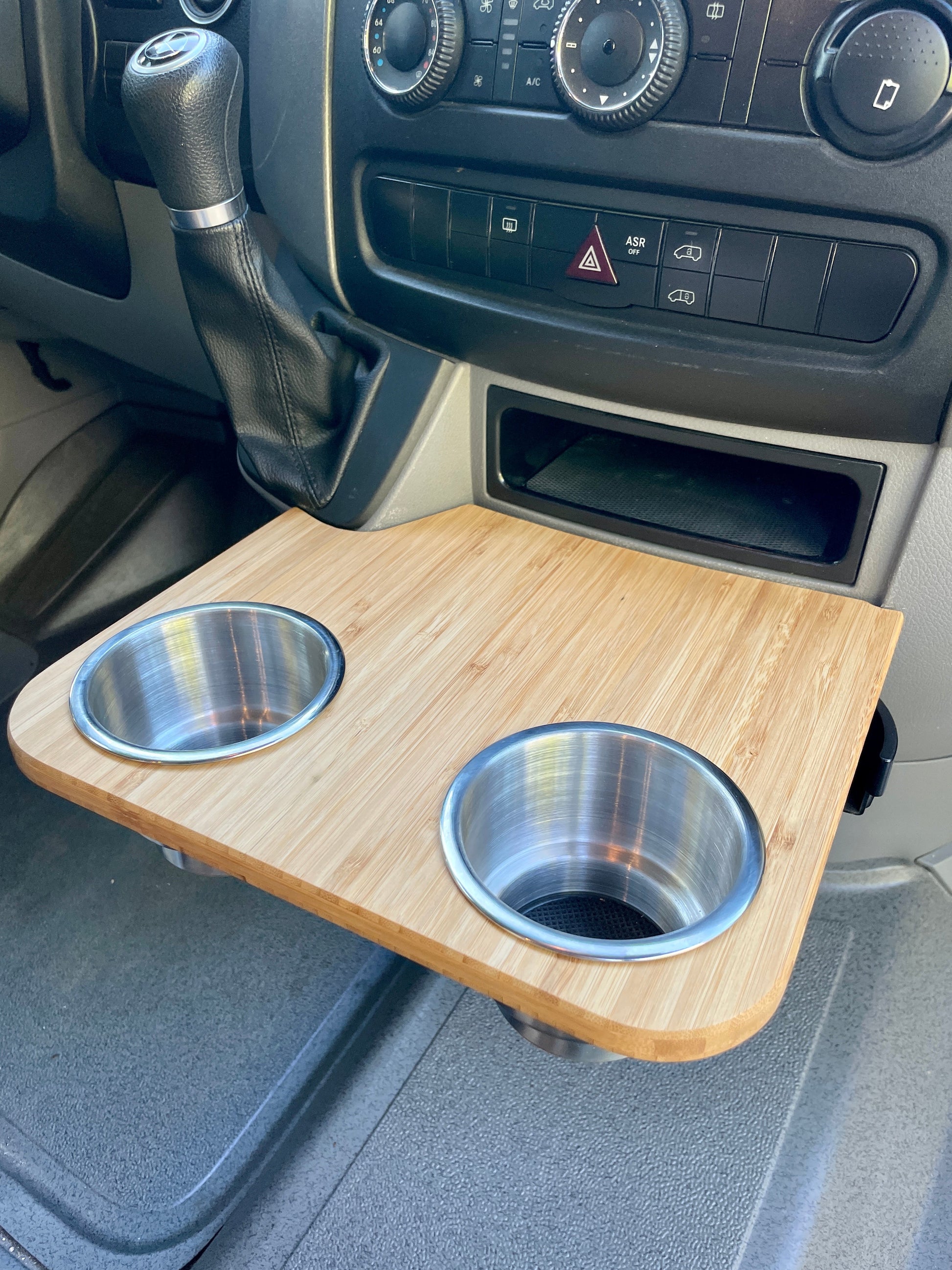 Sprinter NCV3 06-18 Cup Holder Snack Tray with (2) XL Stainless cup holders. Rests on top of the factory sliding cup holders, turning it into a small table. Excellent place to set snacks, phone, or other small items. Size is 12"x10.25" it is large enough to set items but still able to move in and out of the front seats easily. Follows the contour of the dash with enough space to still have a phone charger plugged in below it and run the cord to the top of the cupholders.