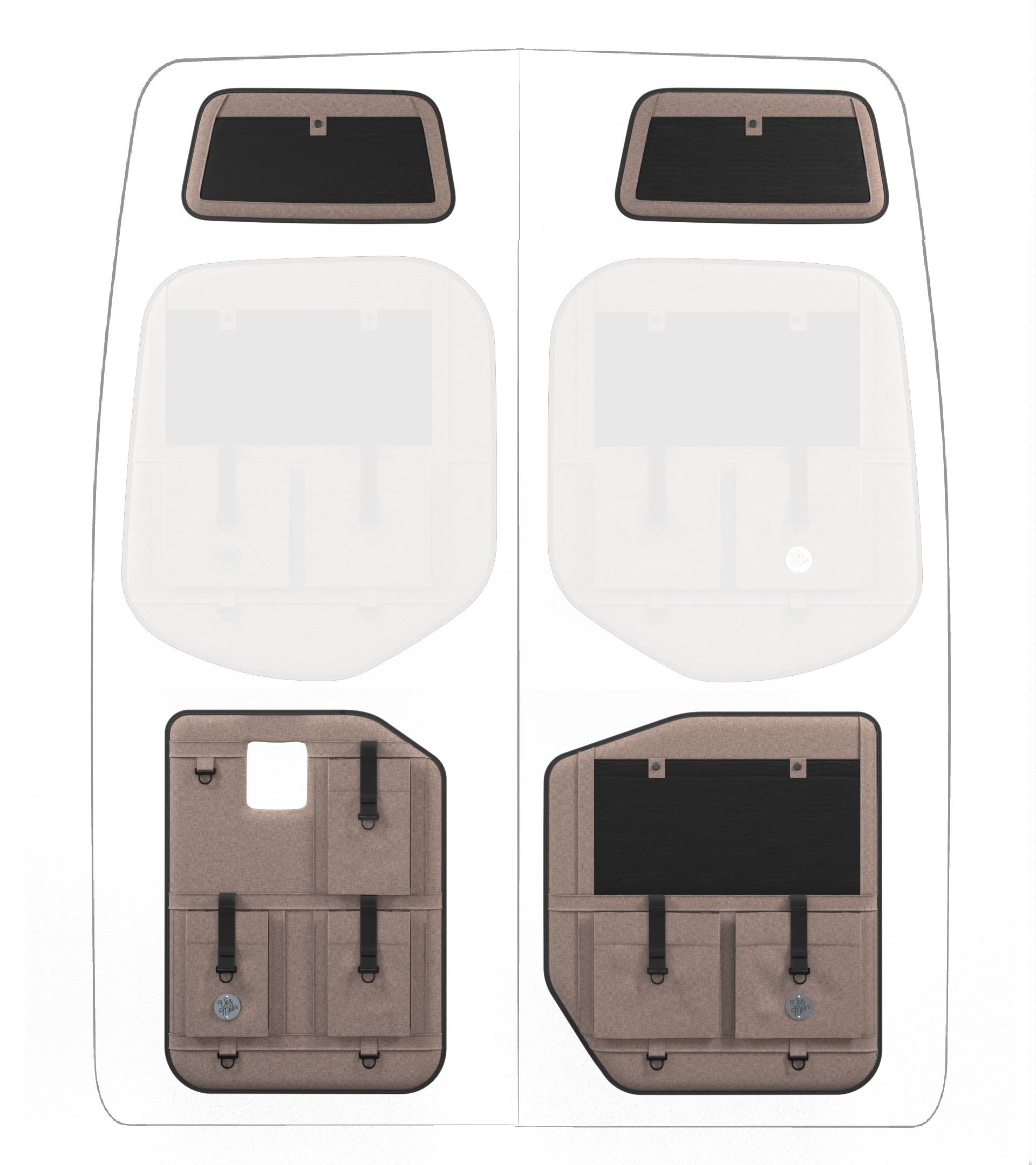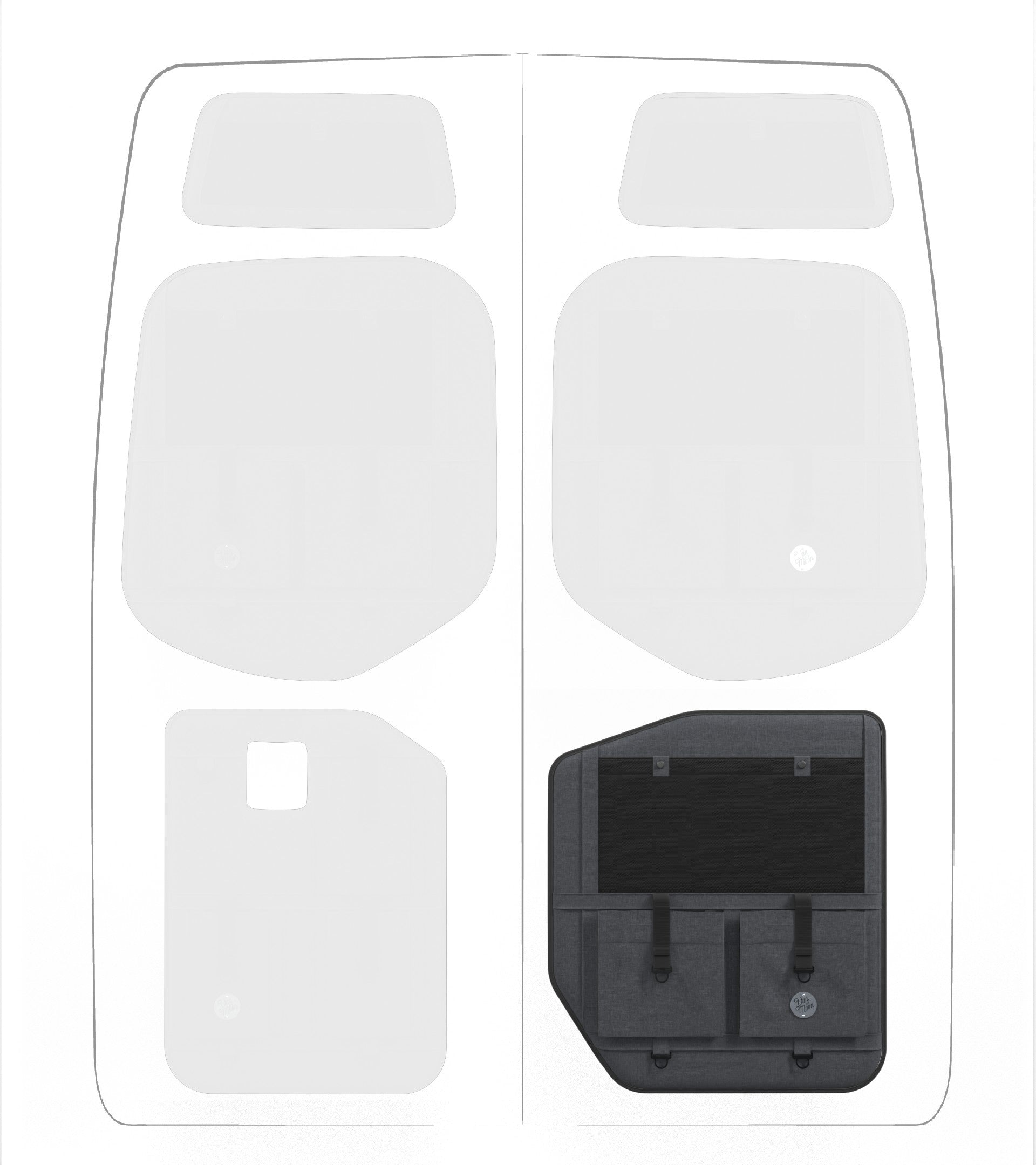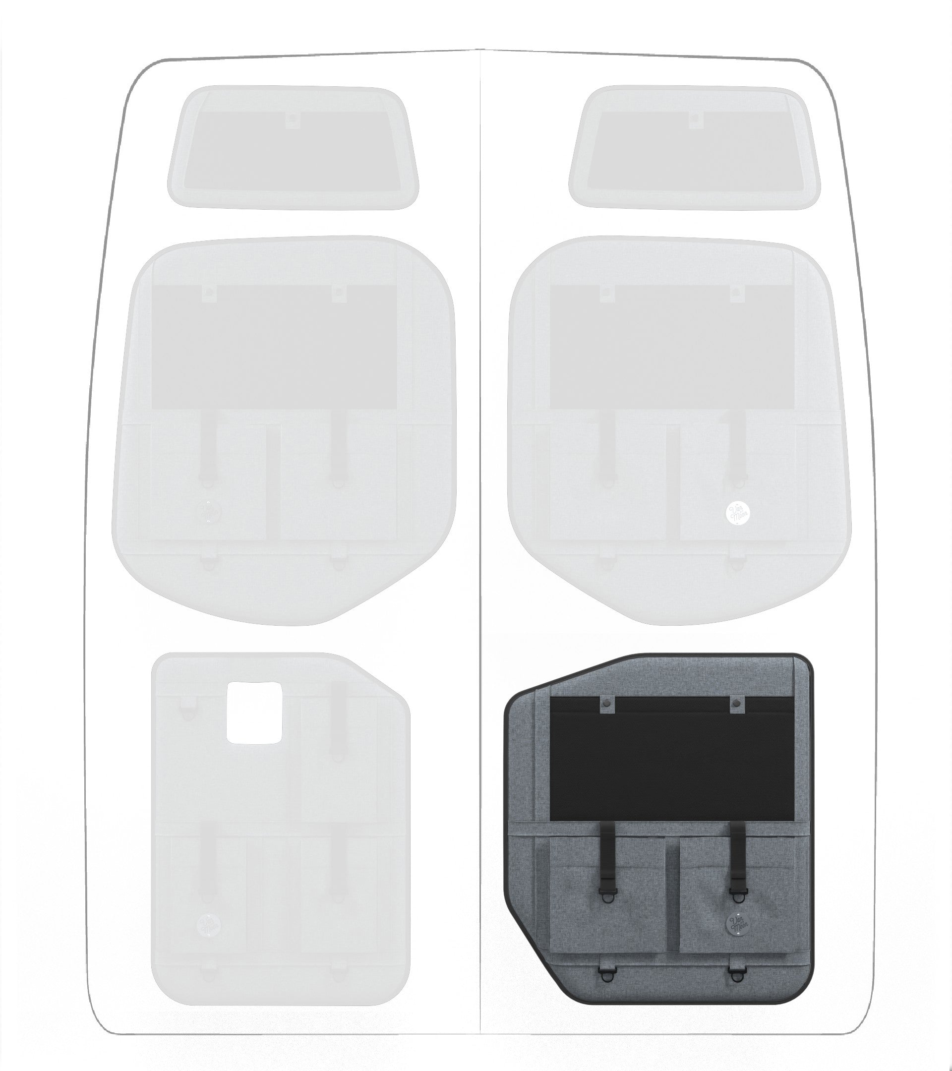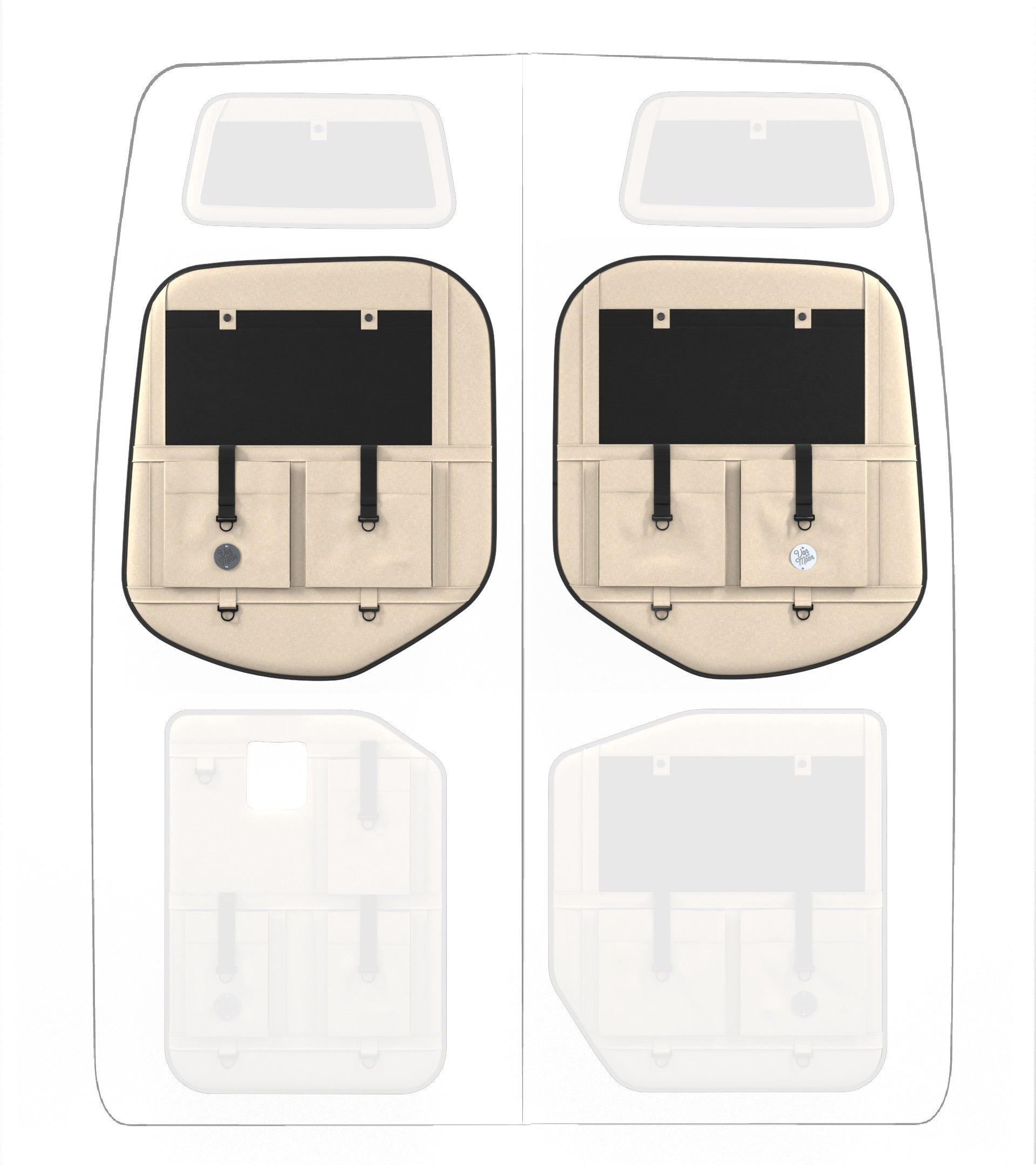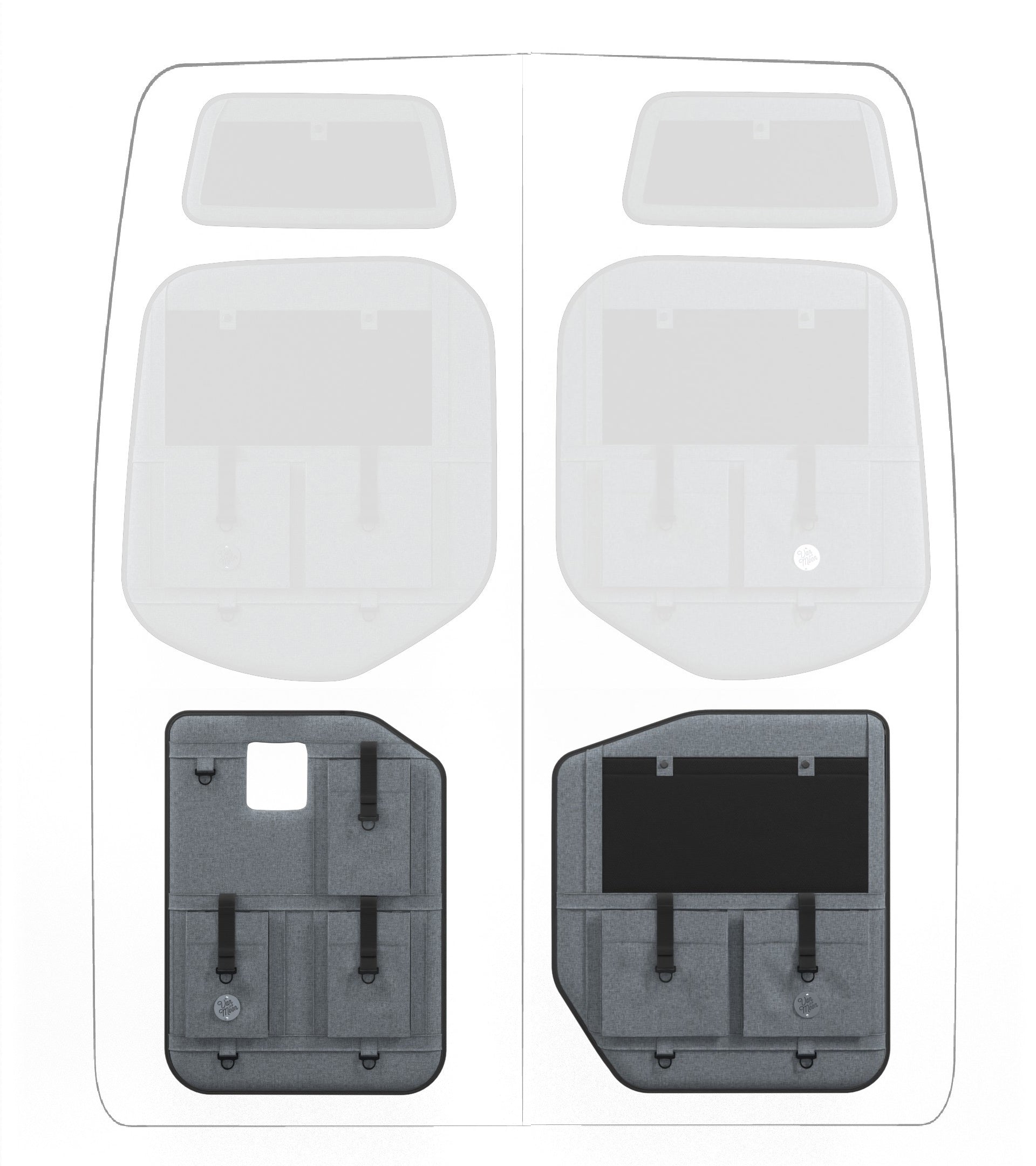 Storage in a van is limited, so why not use your rear doors to expand your space and keep organized? Van Der Moon rear door organizers use a previously ignored space to add functionality and style to your adventure van!