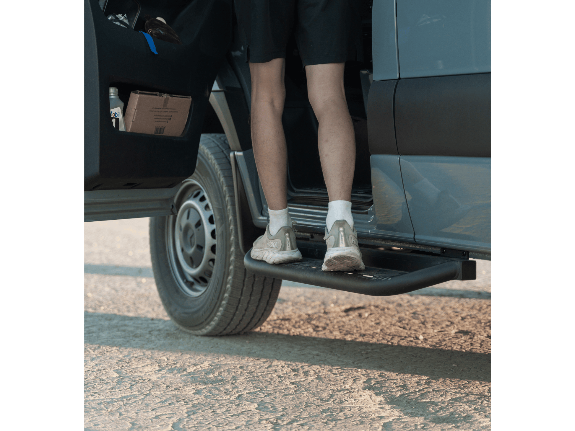 Constructed from high-strength aluminum and finished with a zinc primer and textured black powder coat, these steps are built to resist rust, corrosion, and the abuse of dirt roads and coastal air. They mount high and tight to your van for a clean, modern look that doesn’t compromise ground clearance — perfect for lifted or stock Sprinters alike.