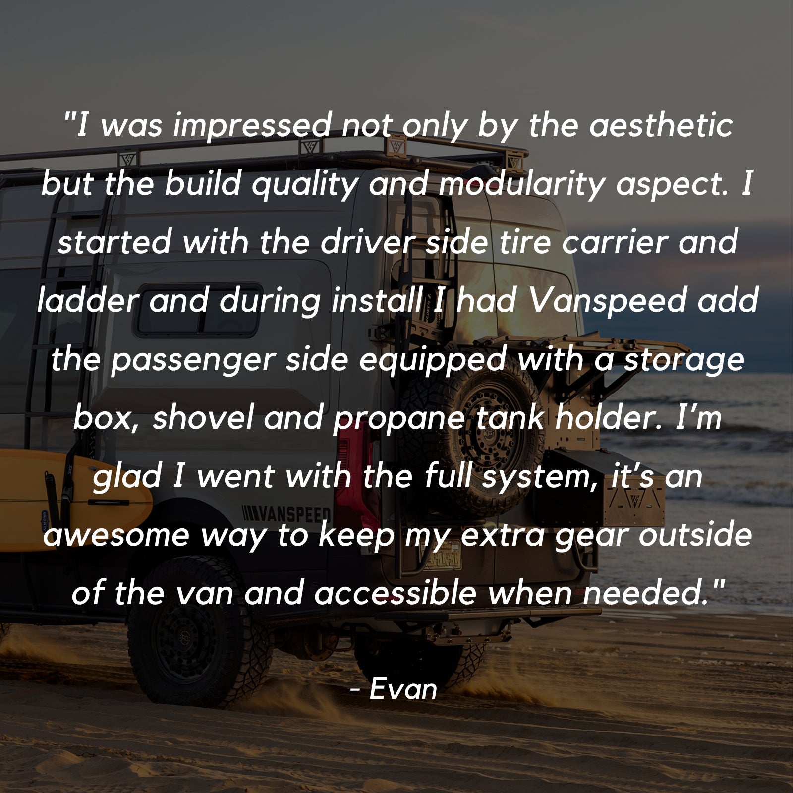 This rear carrying platform sits on the driver's side and allows you to conveniently store your spare tire on the rear of your Sprinter Van. Included with your purchase of the Tire Carrier is the tubular frame structure itself, as well as all the necessary hardware to mount the carrier into place.