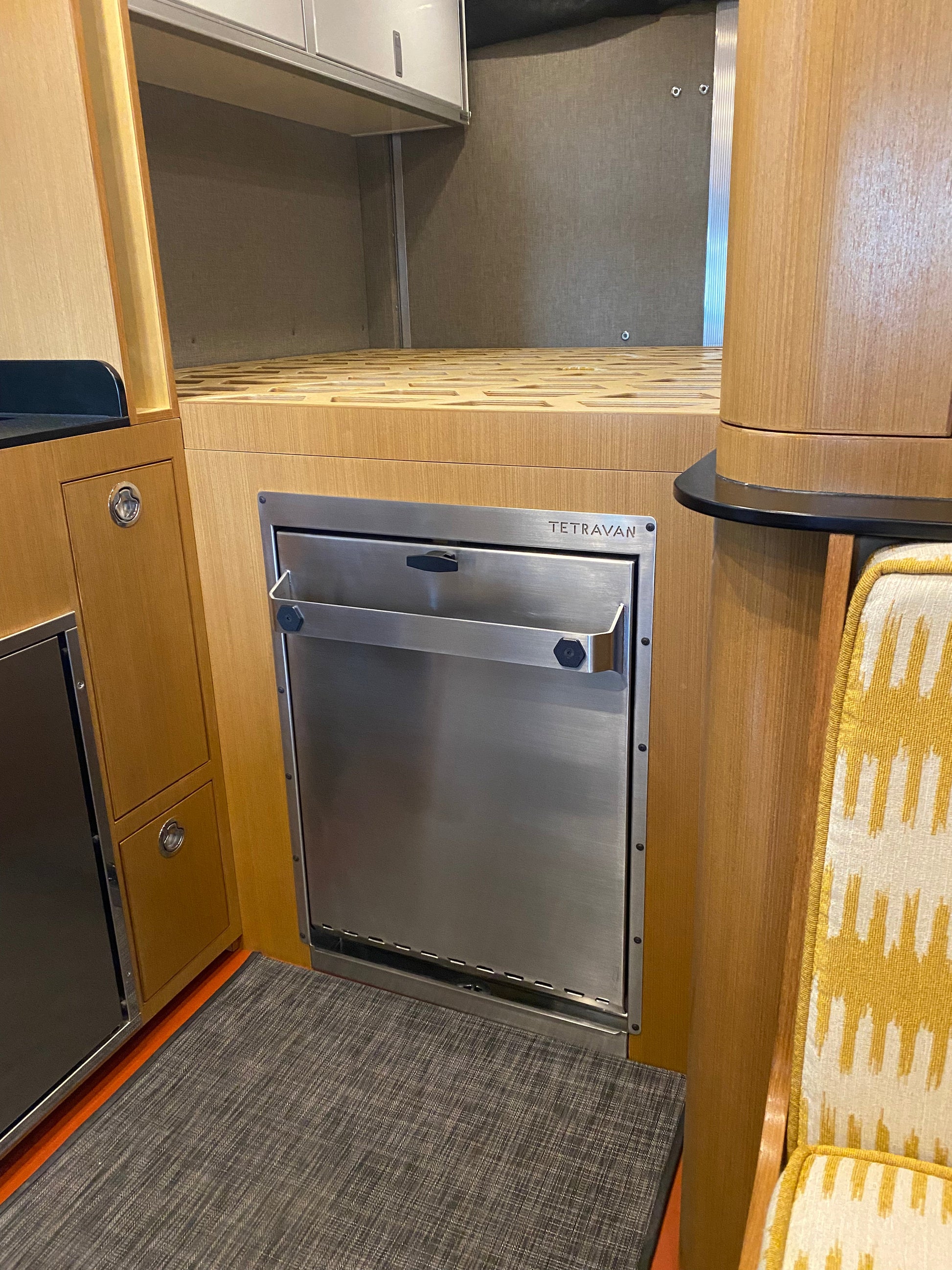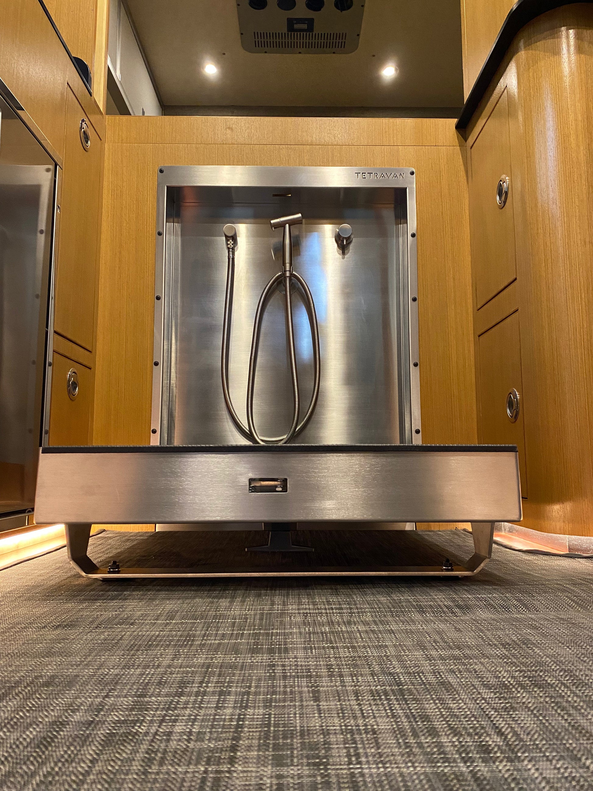 The Tetravan Folding Shower is designed for maximum convenience. Simply fold down the integrated shower pan, connect the included magnetic shower curtain, and your private shower is ready in less than a minute. Once you’re finished, the shower folds neatly back into place, keeping your van interior clean and uncluttered.