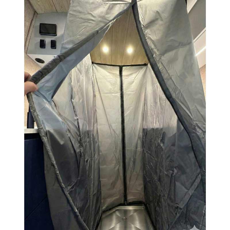 - (Optional) Tetravan Universal Shower Curtain - magnetic waterproof ripstop curtain, perfectly sized and designed to work with the Tetravan In-Floor Shower Pan (71" tall)