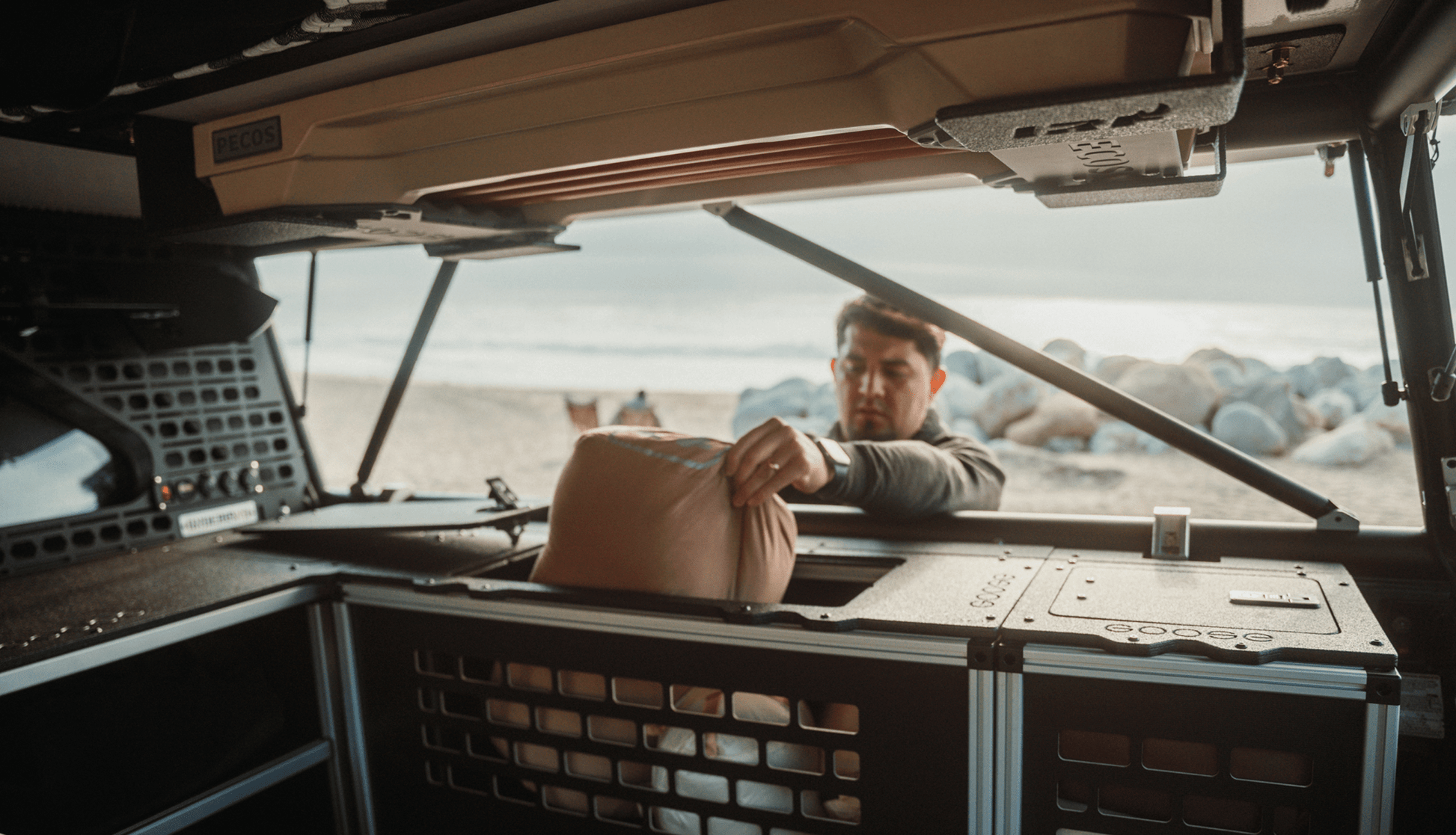 ✔ Bench and Storage Module - Driver Side – A flat-packable, lockable storage module that installs on the driver’s side.