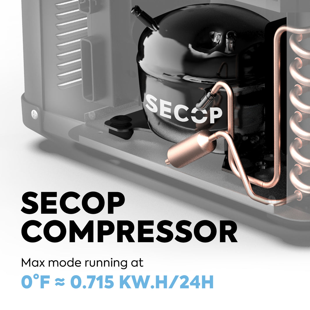 Secop Compressor: Top tier cooling technology, cooling range from 0°F~50°F, to meet the needs of food cold storage, freezer. 5 year warranty on Secop compressor and 1 year for other parts.