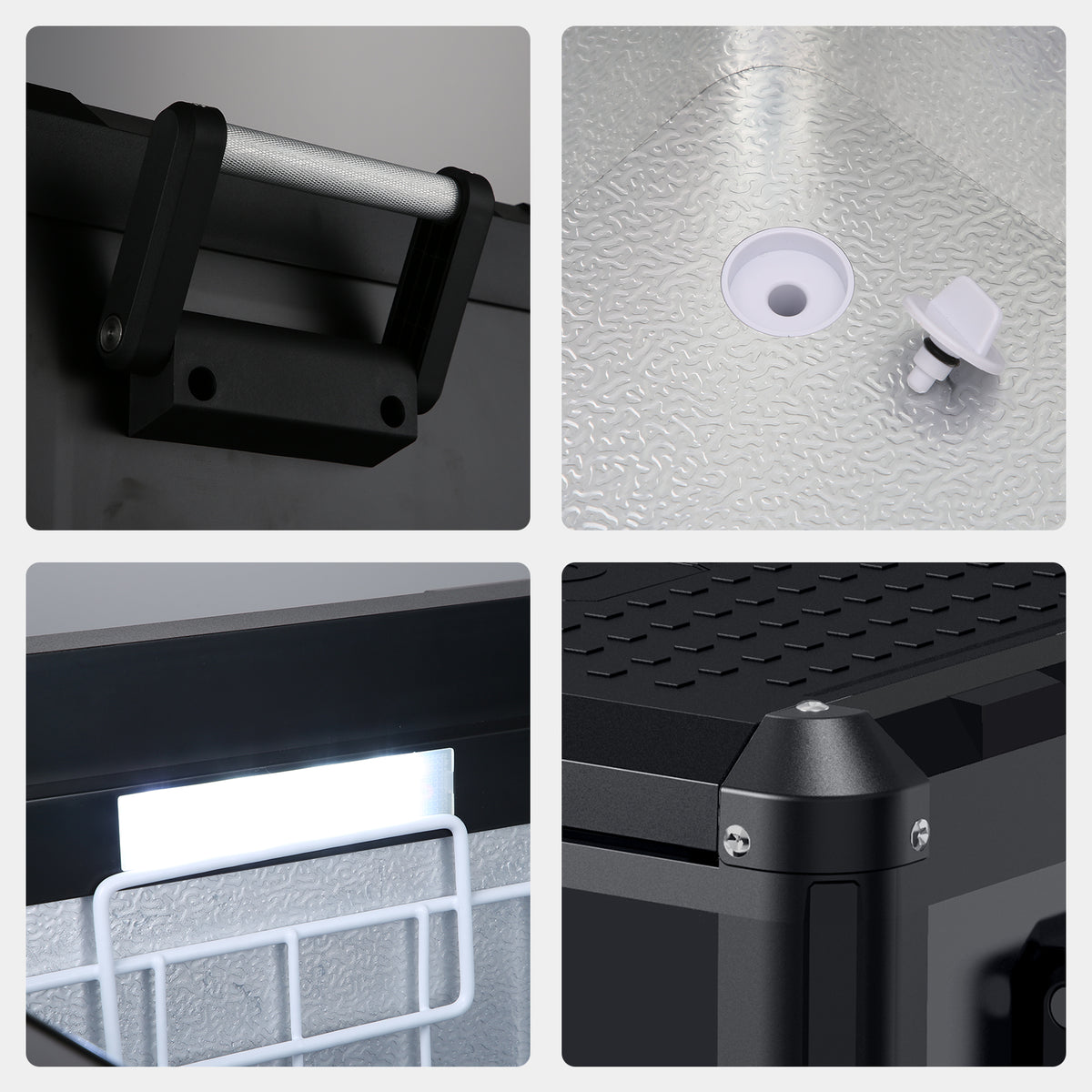 Humanized Design: Weatherproof control panel; Easy to clean the refrigerator box with drain hole. Internal Led Light; Max&Eco Mode; 3 Battery Protection Level.