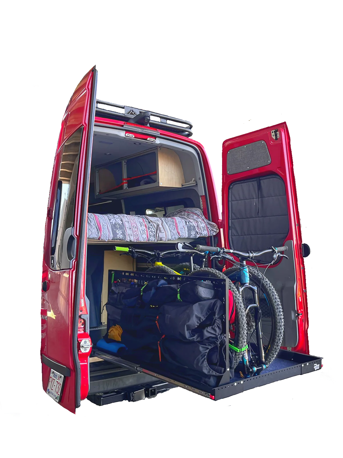Whether you're trying to easily access the very back of your adventure vans gear garage or need to be outfitted to carry multiple bikes the Wave adjustable slide out tray has you locked in.